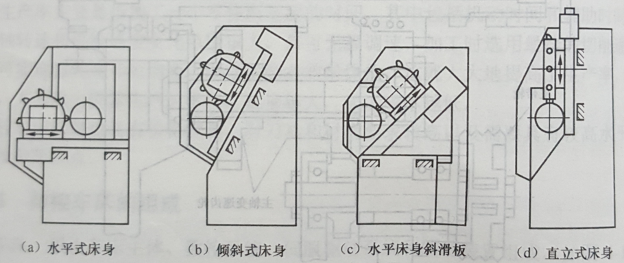數(shù)控車(chē)床的床身結(jié)構(gòu)和導(dǎo)軌有很多種形式,主要有水平式床身、傾斜式床身、水平床身斜滑板以及直立式床身等,其各種布局形式【如下圖所示】